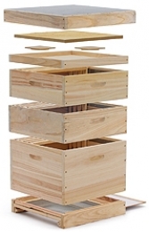 Dak, binnendeksel met board, 1 x broedkamer 482 x 285 mm, 2 x honingkamer met afstandsregels voor 12 ramen 482 x 159 mm, varroabodem met RVS varroagaas + ladeset en vliegspleetverkleiner.